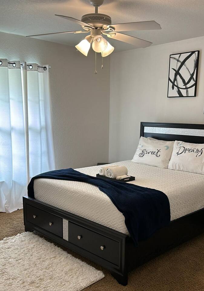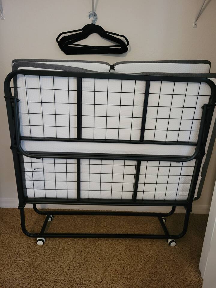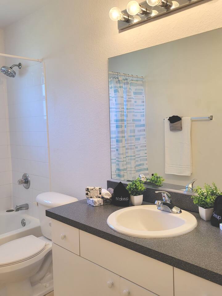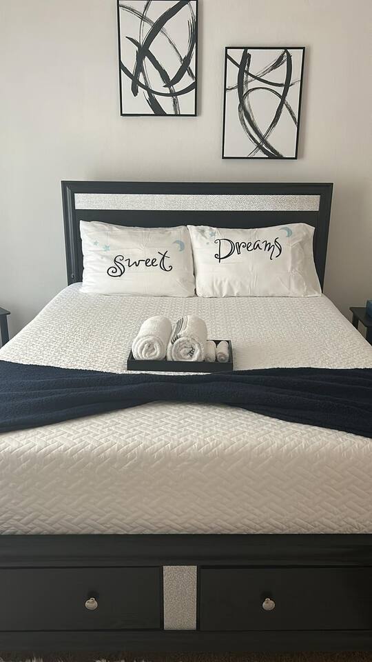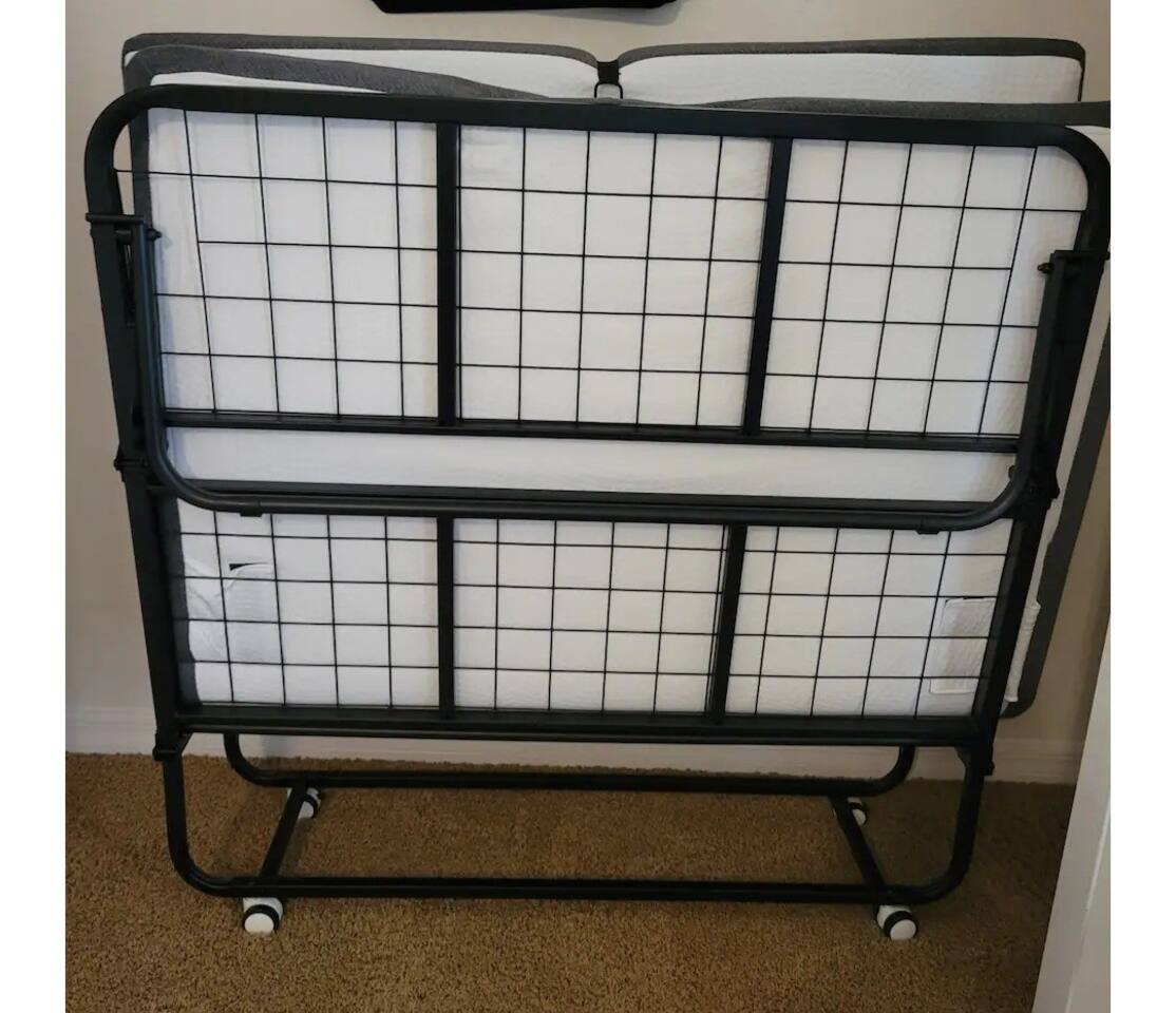 The comfortable space in this home creates a cozy place for business or pleasure for couples, small families, or those traveling for work! Relax in the living room or plan a game night with the family or cook your favorite meal in our fully-equipped kitchen! The master suite includes a comfortable queen-size bed and private bathroom. Just down the hall, you’ll find another full bathroom and the second bedroom with a queen-size bed. Also provided are 2 full-size folding beds for additional sleeping spaces. We have a grilll so that when you’re not sight-seeing or working, you can enjoy the roomy backyard! Oh yeah and a propane fire pit! PARKING - A total of 2 parking spaces in the driveway also allows for convenient access.