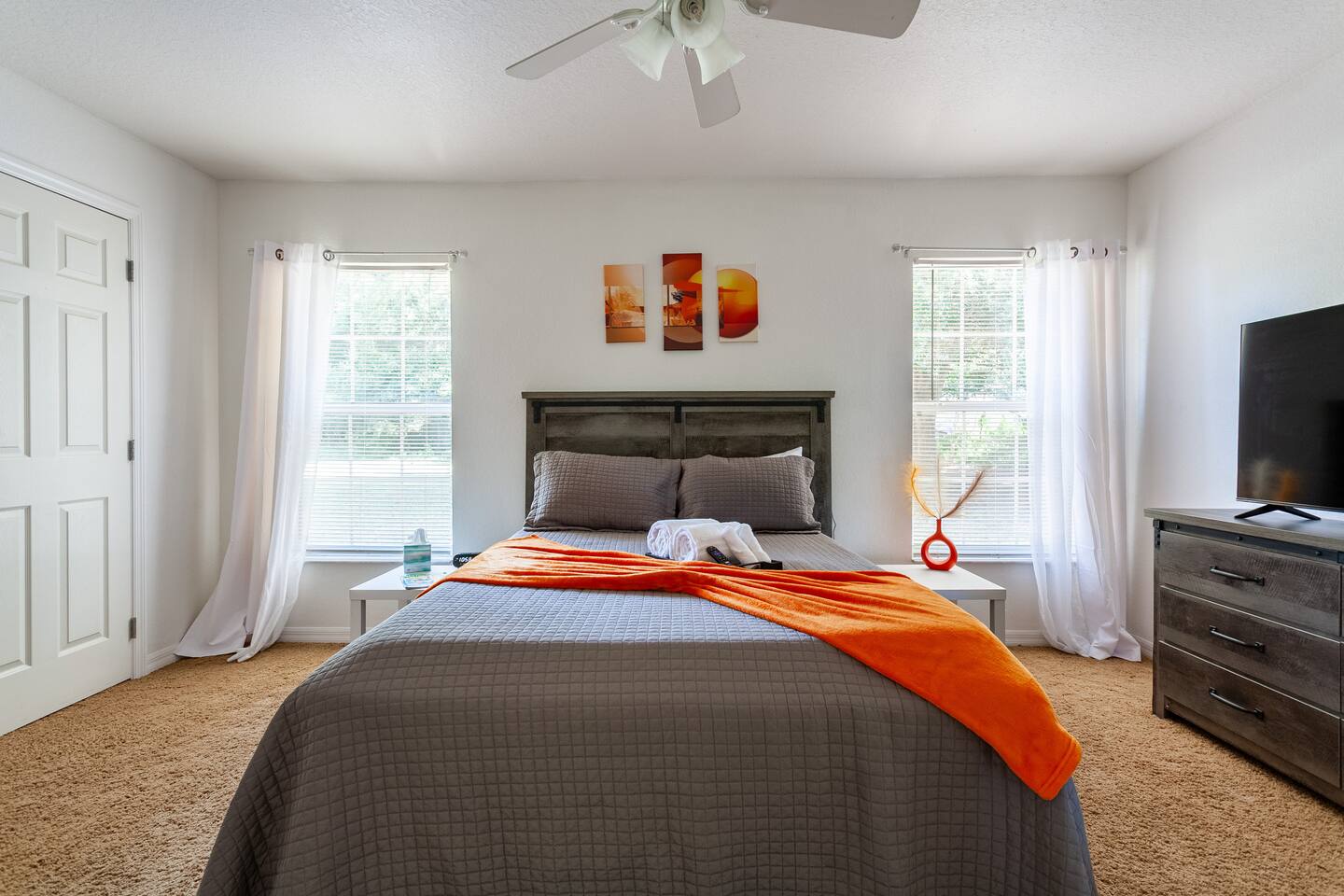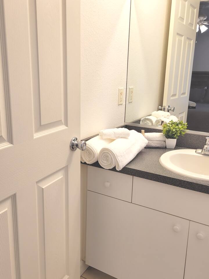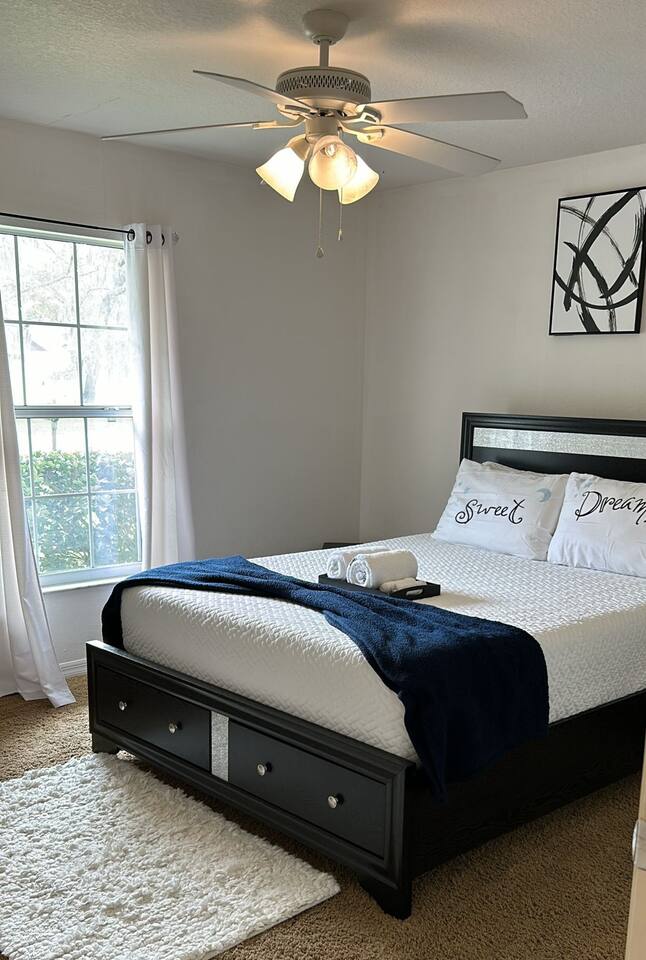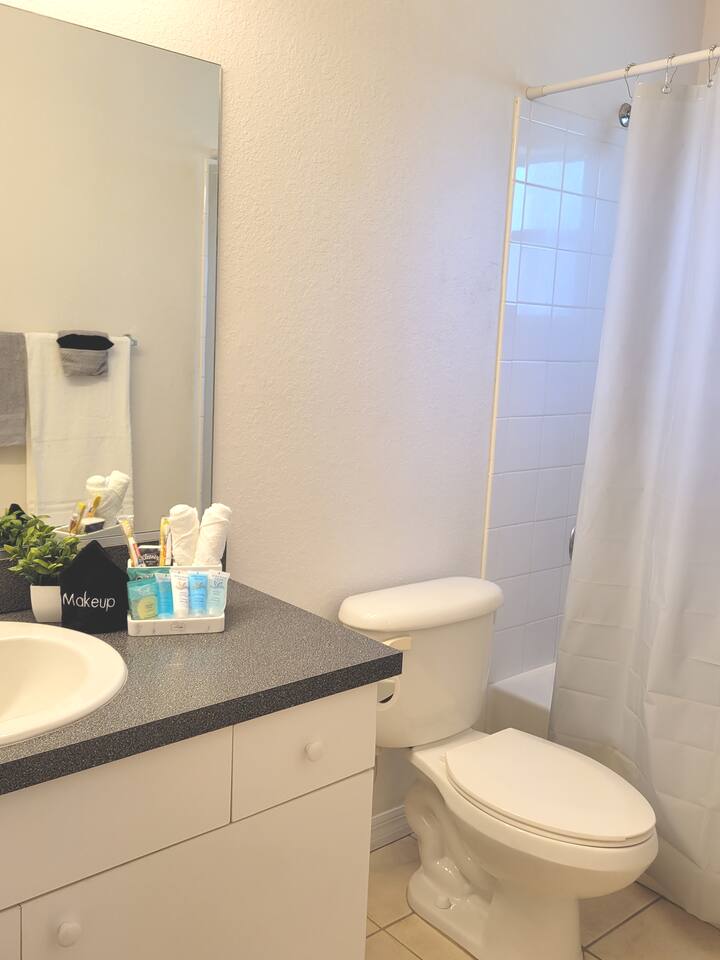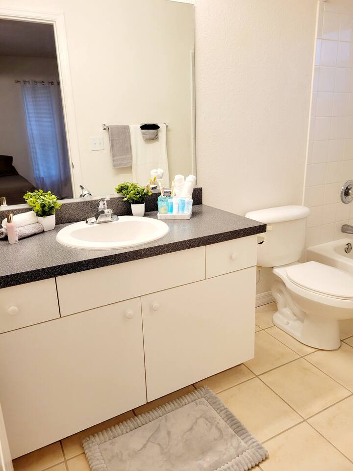 The comfortable space in this home creates a cozy place for business or pleasure for couples, small families, or those traveling for work! Relax in the living room or plan a game night with the family or cook your favorite meal in our fully-equipped kitchen! The master suite includes a comfortable queen-size bed and private bathroom. Just down the hall, you’ll find another full bathroom and the second bedroom with a queen-size bed. Also provided are 2 full-size folding beds for additional sleeping spaces. We have a grilll so that when you’re not sight-seeing or working, you can enjoy the roomy backyard! Oh yeah and a propane fire pit! PARKING - A total of 2 parking spaces in the driveway also allows for convenient access.